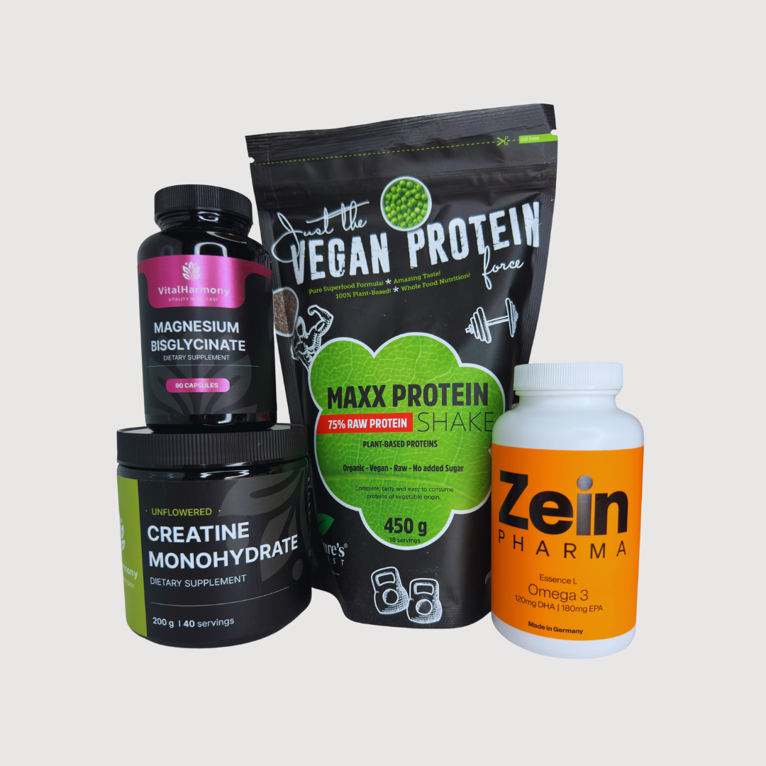 Papildai sportui „TVIRTAS STARTAS”. Papildų rinkinį sudaro keturi produktai, kurie padės turėti daugiau energijos sportuojant, atsistatyti po treniruočių, ir užauginti raumenų masę.